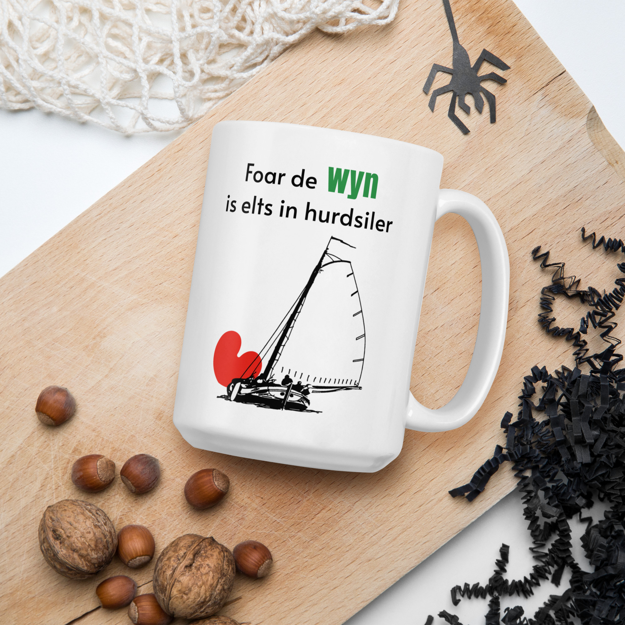 Met deze mok breng je de wijsheid van het Friese zeilwater naar je keuken! "Foar de wyn is elts in hurdsiler" - een spreuk die elke zeiler kent en die perfect weergeeft hoe de wind alles gelijkmaakt op het water. Of je nu kampioen bent of amateur, voor de wind zijn we allemaal hardzeilers. Deze 15 oz mok van Skûtsje Ebenhaezer is gemaakt van premium keramiek met een duurzame print die bestand is tegen dagelijks gebruik. Perfect voor je ochtendkoffie voordat je het water opgaat, of om na een mooie zeildag op te warmen met warme thee. Een echte eyecatcher in elke keuken en een mooi cadeau voor iedere zeilliefhebber die houdt van Friese zeilcultuur.