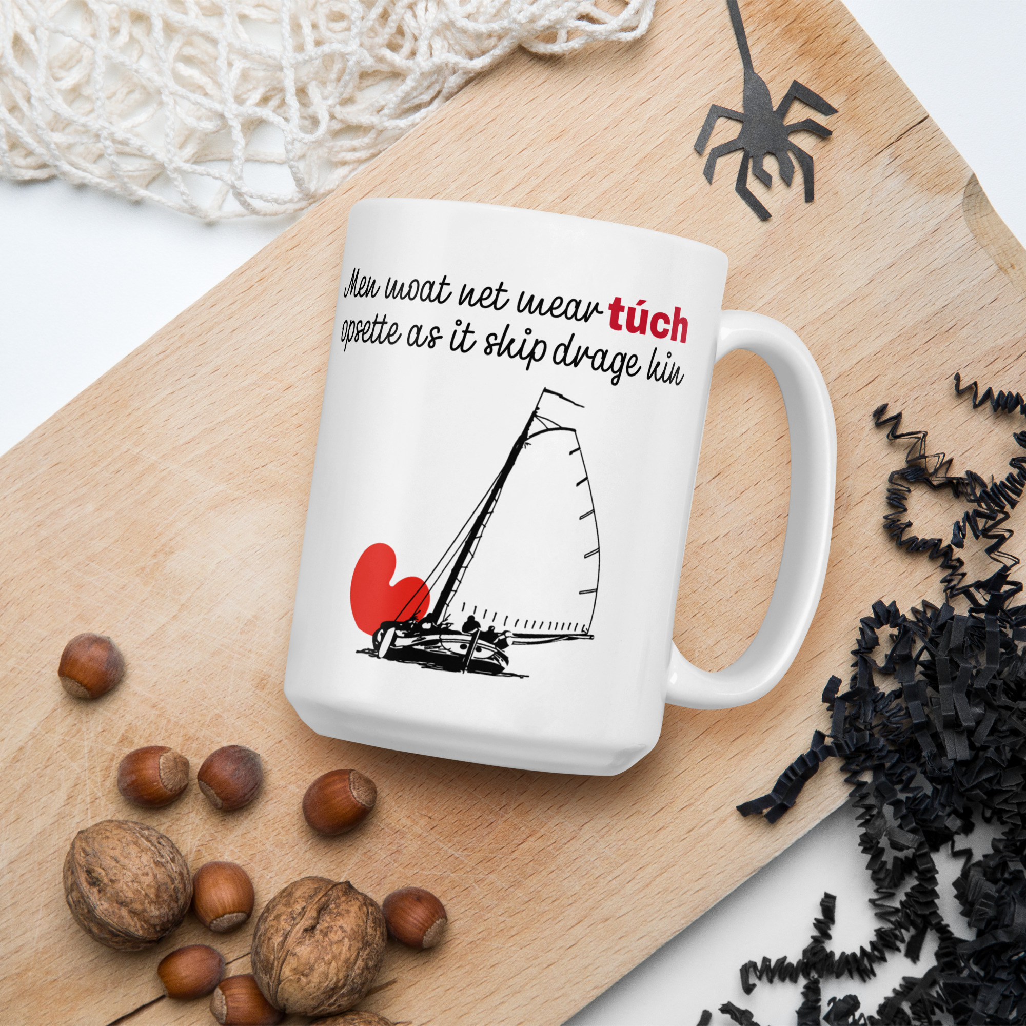 Voor elke zeiler die de wijsheid van het water kent: deze prachtige mok met het Friese gezegde "Men moat net mear túch opsette as it skip drage kin" (Je moet niet meer tuig opzetten dan het schip kan dragen). Een tijdloze waarheid die elke schipper begrijpt - soms is minder meer, en veiligheid gaat altijd voor snelheid. De mok van Skûtsje Ebenhaezer is gemaakt van hoogwaardige keramiek met een duurzame print die ook na vele wasbeurten zijn kwaliteit behoudt. Met een inhoud van 15 oz (circa 440 ml) is er volop ruimte voor je favoriete warme drank. Perfect voor jezelf of als cadeau voor de zeiler in je leven die weet dat echte wijsheid op het water begint met respect voor de elementen en je materiaal.